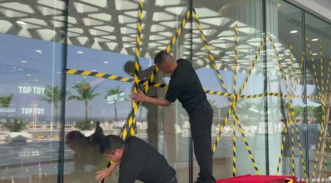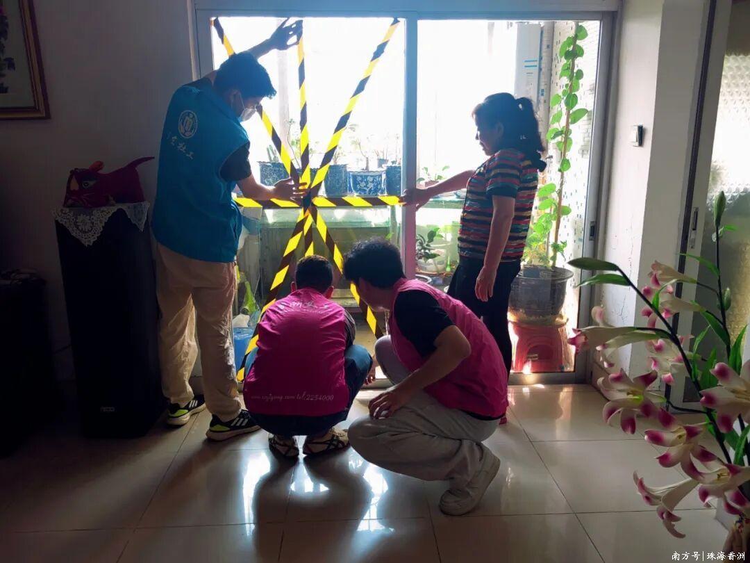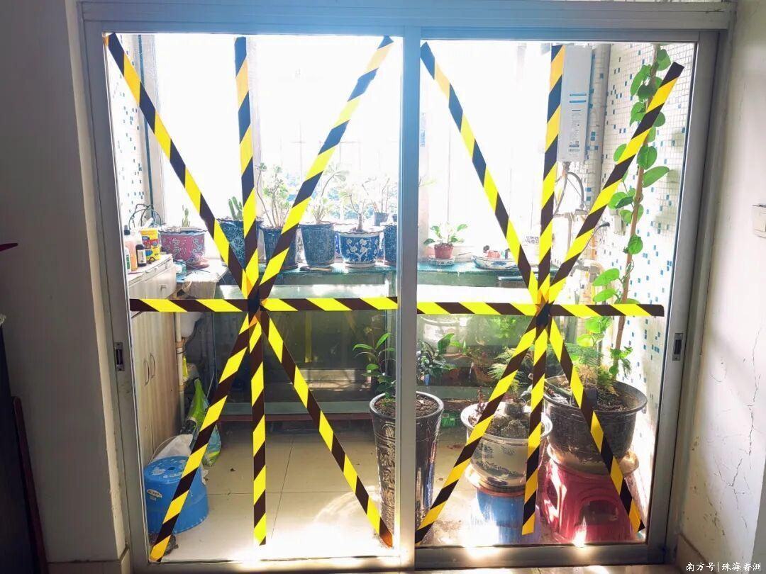 協助居民粘貼“米”字防爆膠帶